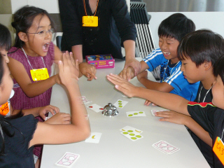 今回のミニ・ゲーム大会は、「ウボンゴ・リレー」でした。「ウボンゴ」を使ってピースをバトンに一人ずつパズルをしていくチーム戦です。速かったチームから順に3点、2点、1点と割り振ってチームの全員にその点数を渡します。チームを毎回くじで組みなおしてこれを3回行いました。最終的に一番多い点数を持っている人が勝ちとなります。
