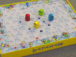 紙が敷かれて中が見えない箱の中には、多くの鉄球が入っています。サイコロを振ってその出目に従い、移動し、氷(紙)を割って、釣り糸を垂らしましょう。最終的に最も多くの魚を釣り上げた人の勝ちです。